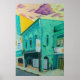 A beautiful urban landscape painting that depicts a green shop house against an orange sky and purple clouds.