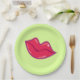 A pair of shining red lips with a a little sparkle and a purple and yellow outline. Subtle white highlights give it a shiny look. Presented on a lime green background.