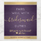 TO CHOOSE YOUR OWN BACKGROUND & TEXT COLORS, SEE INSTRUCTIONS BELOW. Get the wedding celebration started in style with elegant purple, gold and white bridesmaid proposal wine bottle labels. Since they come in sets of six, an idea to add a different personalised name on each one is to hand write with a gold ink pen. All text is simple to customise or delete, including funny quote reading "Pairs well with bridesmaid duties." Design features a brushed purple background, stylish faux gold foil, modern minimalist typography, handwritten style script calligraphy, and customisable bride's name & message that reads "will you be my bridesmaid?" Please note that gold is printed colour, not metallic foil. These trendy unique fine wine accessories make a cute and funny drink idea for the wedding bridal party and pair well with bridesmaid proposal gift boxes, favours, cards and invitations. Cheers to happily ever after!