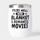 Funny saying - Pairs well with blanket and your favourite movies (change movie genre to suit your requirements) humour wine tumbler from Ricaso - a fun alcohol saying for the movie night. What type of movie will you pair your wine with?