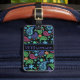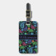 Luggage tag with a colourful paisley and flowers pattern on a black background and customisable text to personalise it.