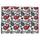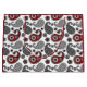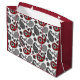Ornate paisley pattern in black, white and shades of grey / grey, accented with deep red, on a white background