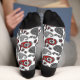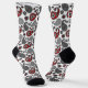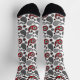 Socks in an ornate paisley pattern in black, white and shades of grey / grey, accented with deep red, on a white background