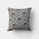 Throw pillow in an ornate paisley pattern in shades of light silver grey / grey to dark grey with black and white on a light silver grey background