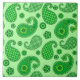 Ceramic tile in an ornate paisley pattern in shades of chartreuse to deep emerald green on a pastel lime green background