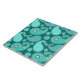 Ornate, lacy, paisley pattern in shades of aqua and seafoam green, accented with white, on a deep turquoise blue background