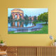 This image showcases the Palace of Fine Arts in San Francisco at dawn. The building is illuminated with warm light, contrasting with the cool blue of the sky. A tranquil pond reflects the palace's architecture, creating a mirrored effect. In the foreground, a park path curves alongside the pond, with benches inviting visitors to sit and enjoy the view.