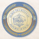The national seal of The Republic of Palau, is set on a pale blue background. The emblem is infused into a faux gold circle shape, and that, in turn, is nestled in the middle of a faux gold laurel wreath.