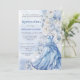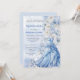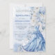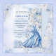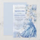 This elegant quinceañera invitation features a soft, romantic design with a dreamy palette of pale blues, whites, and subtle ivory tones. A beautifully illustrated ball gown in flowing blue fabric is showcased along the lower portion, accented with delicate floral embellishments that blend seamlessly into a lush arrangement of oversized blossoms along the side. The typography is refined and graceful, with a mix of classic serif and script styles that enhance the formal feel of the celebration. Set against a light, airy background with gentle texture, the overall composition evokes sophistication, femininity, and a fairytale-like charm—perfect for a memorable coming-of-age celebration.