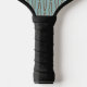 This pickleball paddle has a geometric design of sort of flat-ended ovals repeating across the design in brown on a field of pale blue.