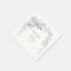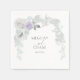 Elegant baby blue, lilac and white rose arch surrounded by pearly iridescent foliage enhances the bride and groom's names and wedding date on these paper napkins in a variety of sizes and styles. Choose cocktail, luncheon or dinner size and coined or non-coined style. This is part of a wedding stationery collection with matching wedding accessories. Design created for the BarefootBride™ © by WhimsicalArtwork™