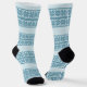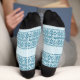 These pretty socks are perfect for the Holiday Season, but can easily go through the entire winter. They feature a repeating pattern of faux knit silhouette poinsettia flower images. The darker blue images are placed on a pale blue background. Broad pale blue and thin dark blue stripes separate the rows of images.