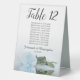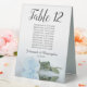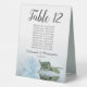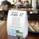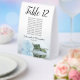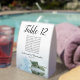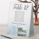 These tent table number signs are not only beautiful, they even include a list of names for the guests at each table, making it easy for your guests to find their seat at your wedding reception. The design is both elegant and romantic featuring a single light powder blue or dusty blue coloured rose lying on its side reflecting in water with waves and ripples. The title is in lacy script calligraphy with bold numbers so your guests can easily find the right table. There is room for the names of the couple and the wedding date.