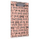 This clipboard features a variety of different eyeglasses and glasses frames in black and white on a pale pink.