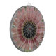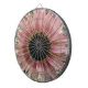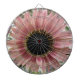 This awesome dartboard features a beautiful photograph of a pale pink sunflower. The sunflower is naturally pink and the petals have a pale pink outer ring and a darker pink inner ring. The middle where the seeds are is black. This photograph was taken in a garden.