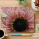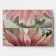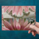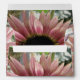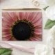This envelope features a beautiful photograph of a pale pink sunflower. The sunflower is naturally pink and the petals have a pale pink outer ring and a darker pink inner ring. The middle where the seeds are is black. This photograph was taken in a garden.