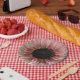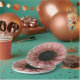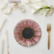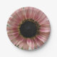 This awesome paper plate features a beautiful photograph of a pale pink sunflower. The sunflower is naturally pink and the petals have a pale pink outer ring and a darker pink inner ring. The middle where the seeds are is black. This photograph was taken in a garden.