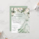 This elegant quinceañera invitation features a soft, romantic design with a delicate botanical theme. The top is adorned with lush ivory roses and muted greenery, accented by subtle gold speckles that add a touch of shimmer. A graceful watercolor-style ball gown in a soft sage green flows along the side, creating a refined and feminine focal point. The background has a gentle textured wash in pale green and ivory, providing a light, airy feel while keeping the center text area clean and easy to read. Classic serif typography in coordinating green tones enhances the timeless look, making this invitation perfect for a sophisticated and nature-inspired celebration.