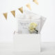 A bouquet of fresh double narcissus flowers tied with a ribbon on a textured background, featuring a beautiful clearwing butterfly. Part of a wedding suite with many matching pieces.
