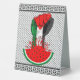 Palestine Flag on Revolution Fist Symbol of freedom coming out from a Watermelon. In occupied Palestine, watermelon is a symbol of resistance. With its colours mirroring the Palestinian flag, the fruit can be seen from the stone walls of Gaza to the galleries of Ramallah, hinting at the political history of a cherished summer fruit. As the Israeli occupiers supremacy did not allow the Palestinians to expose their own Red white black and green original Flag.