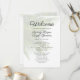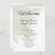 Flat, tropical beach wedding program template with palm fronds. White with black custom text on both sides, this program design has light green palm leaves as the background.