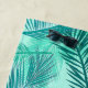Beach towel in a print of overlapping palm leaf silhouettes, in shades of turquoise / peacock and teal, against a light aqua background