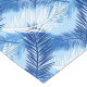 Table runner in a tropical print of overlapping palm leaf silhouettes, in shades of cobalt blue, navy / indigo, and white, against a light sky blue background