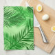 Kitchen towel in a tropical print of overlapping palm leaf silhouettes, in shades of deep emerald green, leaf green, and lime green, against a pastel lime green background