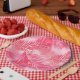 Paper plates in a tropical print of overlapping palm leaf silhouettes, in shades of deep fuchsia pink and coral, against a pastel shell pink background