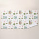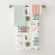 Pattern with illustrations of midcentury modern style houses, flamingos, cacti, palm leaves, and midcentury modern designs. Wash cloth features pink and green stripe design. Hand towel features midcentury inspired pattern over light blue background.