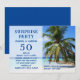 Tropical palm tree birthday party invitations for an adult. The background is a tropical scene with a big palm tree leaning over a calm sea. All text is bright blue and is on the left side of horizontal cards. Only the RSVP text is beneath the palm tree. The sample wording is for a man's surprise birthday, but works for a woman as well. Exchange "surprise" for "birthday" if your party is not a surprise.