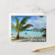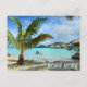 Postcard of a palm tree on sand beach of a luxury overwater thatched roof honeymoon resort on the tropical island Bora Bora, near Tahiti in the pacific archipelago French Polynesia with the text: 'Greetings from BORA BORA'.