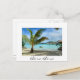 Postcard of a palm tree on sand beach of a luxury overwater thatched roof honeymoon resort on the tropical island Bora Bora, near Tahiti in the pacific archipelago French Polynesia with a white border and the text: 'Bora Bora'.