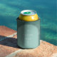White line art palm leaf pattern over aqua background. White palm tree illustration and text over aqua