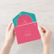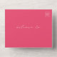 White line art illustration of palm leaves pattern over blue background with white text and seashell design over pink arch with white border. Outside is pink with return address and palm leaf illustration on flap. Rsvp features qr code and traditional format.
