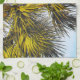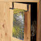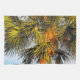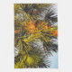 In a tropical mood, the original photograph by MaeFlowers on this Kitchen Towel shows the top of a palm tree with its branches and trunk bathed in the warm glow of the afternoon sun. The long, pointed branches in the background are dark green, spreading out like fans. The branches in the foreground are a light yellow green, curving outward as they catch the sunlight. The tree trunk, normally a medium brown colour, looks almost orange in the late afternoon light. A pale aqua blue sky background sets off the rich earth tones of the palm tree, and completes the tropical scene.