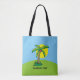 Cartoon illustration of a palm tree. Custom background colour. Custom text on both sides.