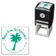 This round, personalised, self-inking tropical return address rubber stamp has a silhouette of a coconut palm tree. It says Aloha from a sample name. The words form a circle around the tree.