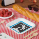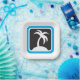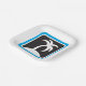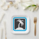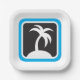 A palm tree icon with a black background and blue frame. This design looks really effective on these Paper Plates