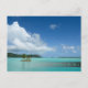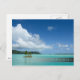 Postcard of a small island with a palm tree in the turquoise lagoon of the tropical island Bora Bora near Tahiti in French Polynesia wit a fading bar and the text: 'Bora Bora'.