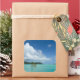 Square photo sticker of a small island with a palm tree in the turquoise lagoon of the tropical island Bora Bora near Tahiti in French Polynesia.