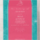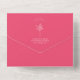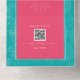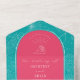 White line art illustration of palm leaves pattern over blue background with white text and seashell design over pink arch with white border. Outside is pink with return address and palm leaf illustration on flap. Rsvp features qr code.