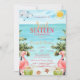 Pink flamingos with palm tree, cocktails on the beach. This invitation is easily customised for your event by simply adding your details.