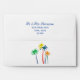 Modern, tropical, summer wedding envelope, with custom return address and calm ombre yellow - blue inside.