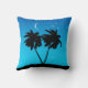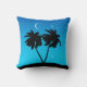 Throw pillow in a black silhouette of palm trees on a tropical island, against an evening blue gradient background with stars and crescent moon