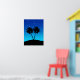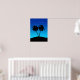 Print with a black silhouette of palm trees, against an evening blue gradient background, sprinkled with stars