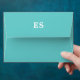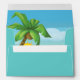 Palm tree & starfish tropical beach destination wedding envelope with monogram, featuring a tropical scenery: a palm tree with coconut on a sandy beach with starfish, blue sea/ocean water and the sky with the sun and clouds on the inside. Great for a summer, tropical, beach wedding. Blue, green, yellow, brown.