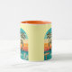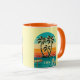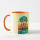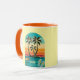 This colourful beachy coffee mug has a retro look with a stylised graphic design of palm trees curved and framed against an arch of sunset and sky colours in stripes of popular teal, gold, orange, and red. The palm trees set atop teal distressed beach wood, with a beach sign and flip flops in front of it. Your monogram initials appear in a gold colour so make sure to edit the placeholders in the Personalised section. The mug background - all but the handle area - is in a pale yellow, and the option shown here includes a dark orange "sunset coloured" handle and cup inside. Other mug and stein options are available.