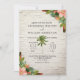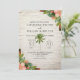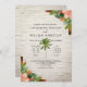 A wedding invitation featuring tropical flowers and leaves at top right and bottom left with a coconut palm tree at centre. Background is white brick.