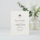 This save the date postcard features simple typography focal on the silhouette of a palm tree in black on ecru for a modern and minimalistic Save the Date postcard for your upcoming wedding. All text is editable to fit your personalised needs.